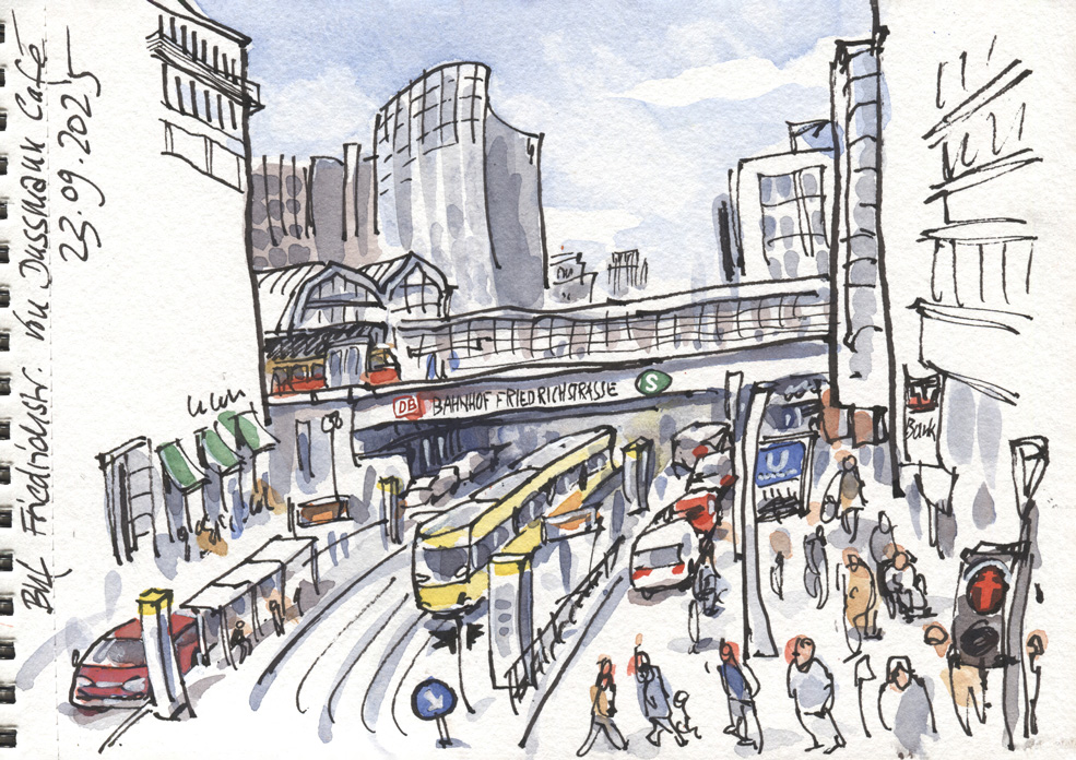 Blick aus dem Café des Kaufhaus Dussmann auf die Friedrichstraße. Im Hintergrund der Bahnhof.