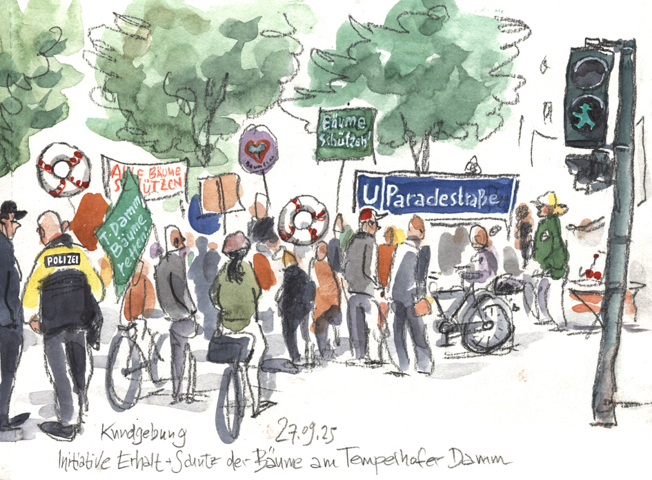 Tempelhofer Damm Ecke Paradestraße, gegen die Fällung von knapp 200 Bäumen und den Verlust weiterer 100 Bäume am T-Damm durch Wurzelschädigungen während der Sanierungsphase 2027 bis ca. 2037. Es sollen nur etwa 28 Bäume übrig bleiben!